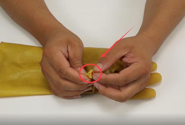 現在熱熔膠已經冷卻,我們可以把多余的氣球剪掉,如果說不嫌礙事的情況下我們就不用剪了,我們直接把它翻轉過來就可以,大家看一下我們的熱熔膠,已經通過我們的縫隙多出一塊兒來,這樣就不會讓我們的手套再去漏水了,我們手套就可以修復的非常完美了。