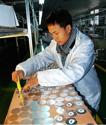 圖為投入試生產(chǎn)的LED車間工作人員在涂散熱材料
