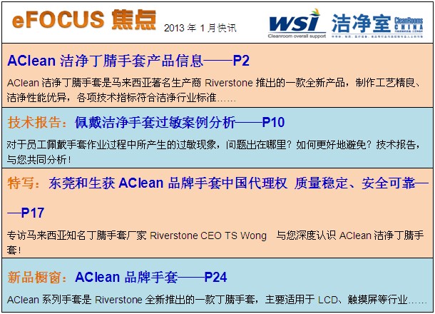 如今,WSI與CleanRooms-CHINA就污染控制項目達成一致理念,并建立長期聯盟合作關系。攜手并進,不斷提供更多、更強、更專業的潔凈資訊!WSI,將4期/年的國際慣例,在該雜志上投放最新、最專業、最具權威性的產品信息,先后共呈現了點膠針筒、無塵布、吸塑包裝盒、丁腈手套、AClean品牌潔凈丁腈手套等等內容;同時,WSI堅持定期向該雜志提交專業技術稿件,為各大企業提供即時、具有極大幫助效益的相關文章。例如:如何提高產品優率、佩戴潔凈手套過敏案例分析等等,一直以來都受到廣大高新科技企業的青睞,讓他們從骨子里學習到潔凈室技術知識!另外,WSI也會把相關專家訪談,以最具時效性的步伐,呈送到各行各業中!